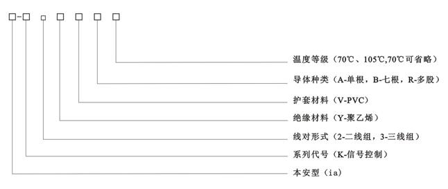 例:铜芯R类结构,聚乙烯绝缘,二线组,聚氯乙烯护套,有加分屏蔽和总屏蔽10对1.0mm2表示为:ia-K2YVPR10*2*1.0mm2