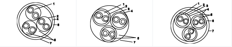 1、对绞线组 2、隔离层 3、对屏蔽 4、隔离层 5、填充 6、总屏蔽 7、隔离层外护套
