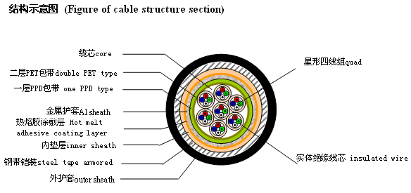 图示为铁路信号电缆结构示意图,其结构与矿用信号电缆大同小异,与他一样,矿用信号电缆的结构大体也包含了这几个部分。