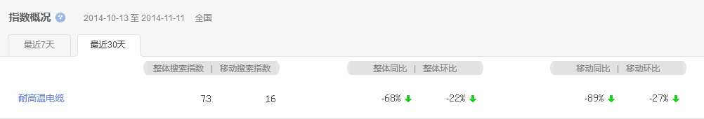 从上图可以清晰的看出,耐高温电缆的需求量确实在下滑,不论在PC(电脑终端)端的搜索量还是在移动终端(手机、平板电缆等)的搜索量都呈现不可逆的下滑趋势,最近30天耐高温电缆的整体搜索指数为73,移动搜索指数为16。整体同比下降68%、环比下降22%,移动同比下降89%、环比下降27%。预计未来的4~5个月内耐高温电缆的指数将不会有明显的改观。这个时候人们的耐寒电缆的需求又了一定的提高,然而在每年的其他季节,耐寒电缆的搜索指数是相当的低的,原因就是中国不属于极寒国家,所以耐寒电缆的需求量就较小。其次生产工作中一般会产生的都是高温作业环境,很少会产生低温作业环境,所以耐高温电缆一直是人们关注的线缆种类之一。