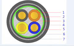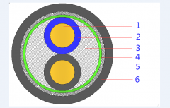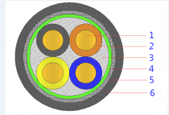 1-导体 2-绝缘 3-填充 4-绕包 5-内护层 6-钢带铠装 7-护套 1-导体 2-绝缘 3-填充层 4-绕包层 5-铜带屏蔽 6-护套