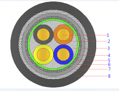 1-导体 2-绝缘 3-填充 4-绕包 5-铜带屏蔽 6-内护层 7-钢带铠装 8-护套